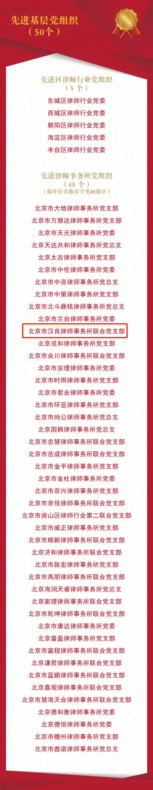 汉良联合党支部荣获中共北京市律师行业委员会授予的"先进基层党组织"